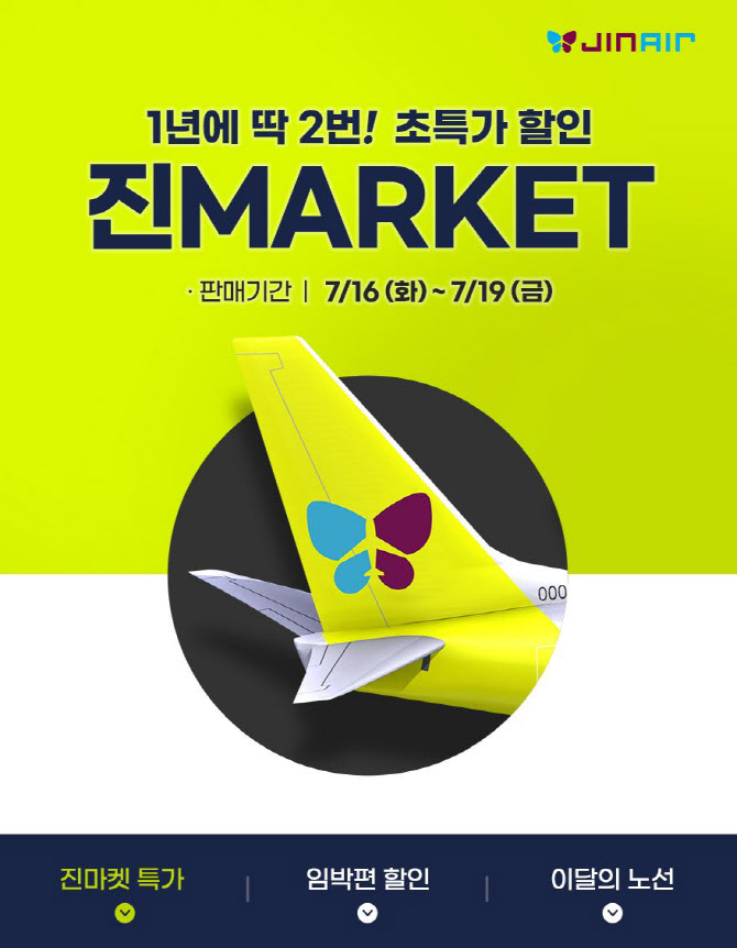 진에어는 연중 최대 특가 프로모션 '진마켓' 하반기를 7월 16일부터 19일까지 진행한다. 탑승 기간은 2024년 10월 27일부터 내년 3월 29일까지로, 동계 시즌 여행을 계획하는 고객들에게 특히 매력적인 할인 행사이다. 국내선과 국제선을 모두 대상으로 하며, 주요 노선의 최저 운임은 10만 원대부터 시작하여 매우 저렴한 가격에 항공 여행을 즐길 수 있는 기회이다. 1. 기간: 2024년 7월 16일 (화) ~ 7월 19일 (금) 2. 탑승 기간: 2024년 10월 27일 (일) ~ 2025년 3월 29일 (토) 3. 주요 내용1)  대상 노선: 국내선 및 국제선 (동남아, 동북아, 일본, 대만, 마카오 등)2)  최저 운임:인천~괌 : 133,600원인천~방콕: 119,400원인천~치앙마이 : 11..