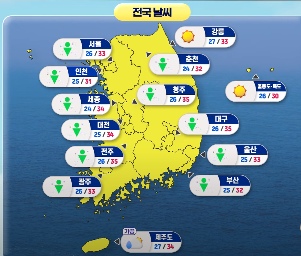 2024년 7월 25일 중복 날, 서울의 한낮 기온이 35도에 이를 것으로 예상되며, 폭염이 지속될 전망이다. 기상청에 따르면, 이날 전국 대부분 지역에 폭염특보가 발효되며, 체감온도가 35도를 넘는 곳도 있을 것으로 보인다. 서울은 33도, 대전 34도, 대구와 전주가 35도 등으로 예상된다. 또한, 돌풍과 천둥·번개를 동반한 강한 소나기가 내릴 가능성이 있으며, 소나기가 지나간 후에는 다시 기온이 오르고 습도가 높아질 것으로 보인다. 미세먼지 농도는 대기 확산과 강수의 영향으로 전 권역에서 '좋음' 수준을 유지할 전망이다. 1. 오늘의 날씨 전망1) 폭염주의: 중복인 오늘(7월 25일) 전국 대부분 지역이 폭염특보를 발효하고, 최고 기온이 35도까지 오르는 등 매우 더운 날씨가 예상된다.2) 소나기:..